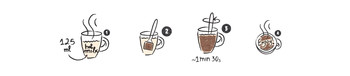 Sabadì propone una nueva forma de hacer chocolate en taza. Finalmente simple, divertido y efectivo. Basta insertar la cucharita con el cubito de chocolate en una taza con leche (o agua) caliente - hirviendo como se indica en el dibujo y luego mezclar delicadamente hasta que se disuelva por completo (unos 1 minuto y 30 segundos). Obtendrás un chocolate muy denso... ¡slurp!